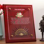 This beautifully crafted timber plaque features a mounted version of the seventh iteration of the iconic Rising Sun Hat Badge, accompanied by a small replica of the Hutton Trophy of Arms, the revered symbol believed to have inspired the design of the Rising Sun Badge. At the front of the plaque, a clear acrylic panel is engraved with a brief history of the Rising Sun, offering a thoughtful narrative behind this powerful emblem.
