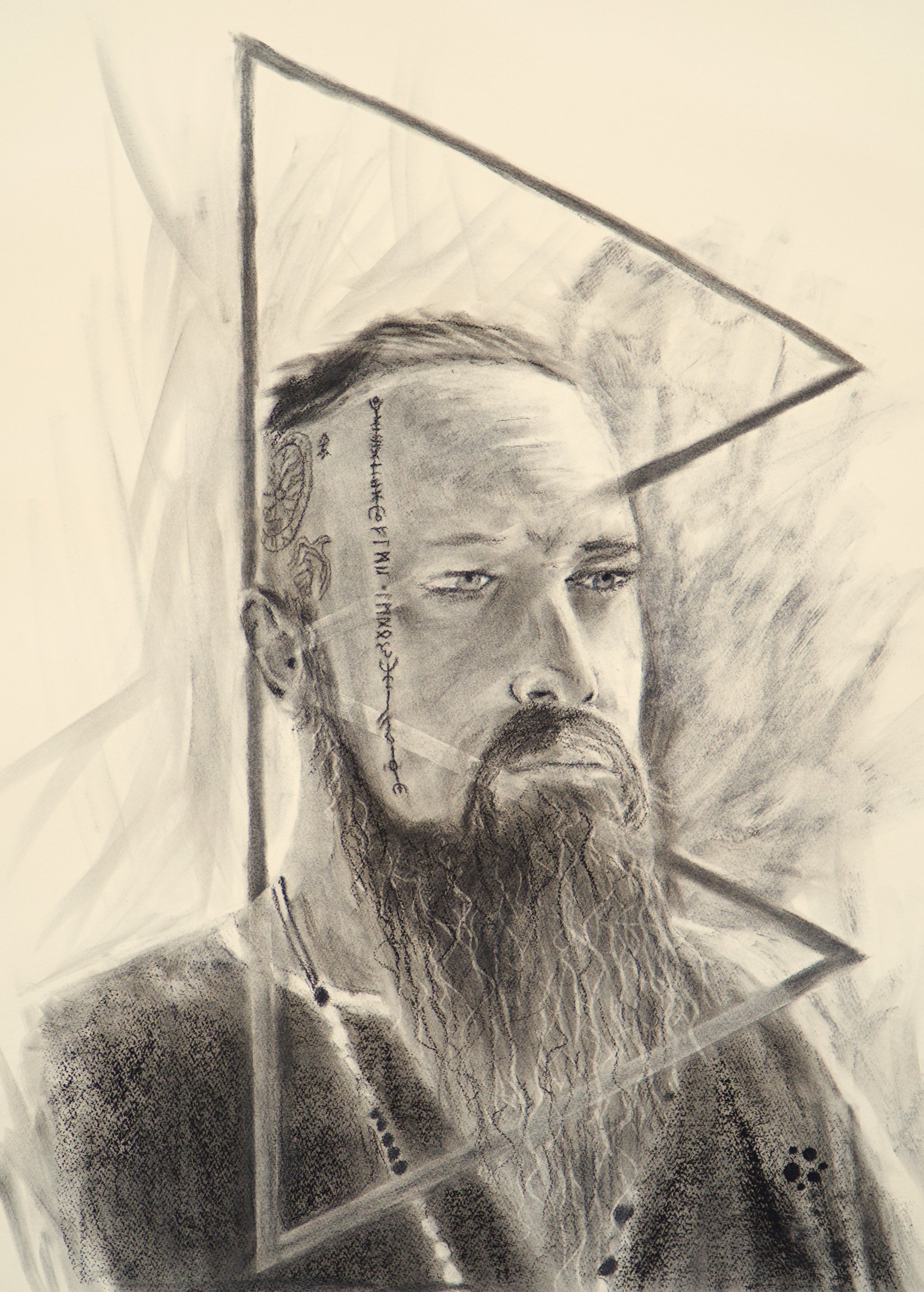 This portrait depicts Jordan “Ragnar” Miinchow, an Army veteran who has embraced his Norse heritage as a source of identity and purpose beyond service. He crafts his own clothing, makes mead, hunts with a bow, and works in blacksmithing and leather craft, living daily within the traditions he values. Drawn resolute and at peace, his face carries cultural symbols marked in his own handmade facepaint, a testament to self-expression and continuity. The work reflects not only his personal journey but the strength found in heritage, craft, and living with intention after service.